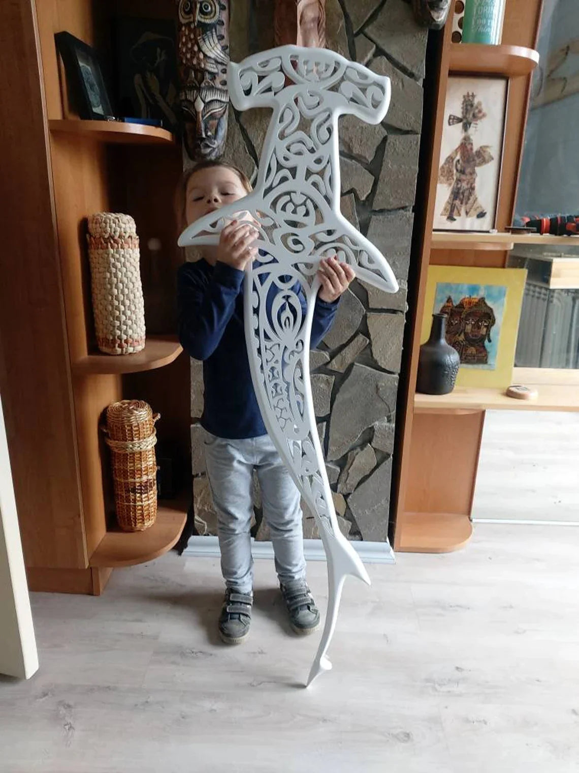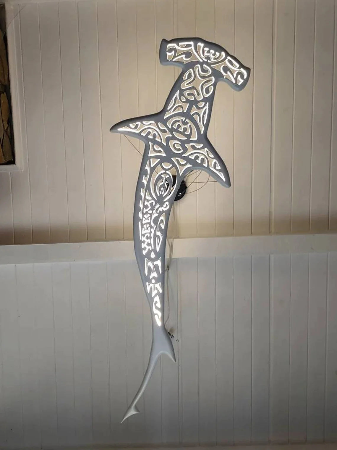 Introducing the Handcrafted Unique Wooden Shark Hammer Ceiling Chandelier! This one-of-a-kind LED wall lamp is the perfect addition to any beach, coastal, or nautical themed home or room. It features a maori surf style design, making it a truly unique and stylish piece. The chandelier is handcrafted using high-quality wood, ensuring durability and longevity. Add a touch of the ocean to your home with this gorgeous wooden shark hammer chandelier.