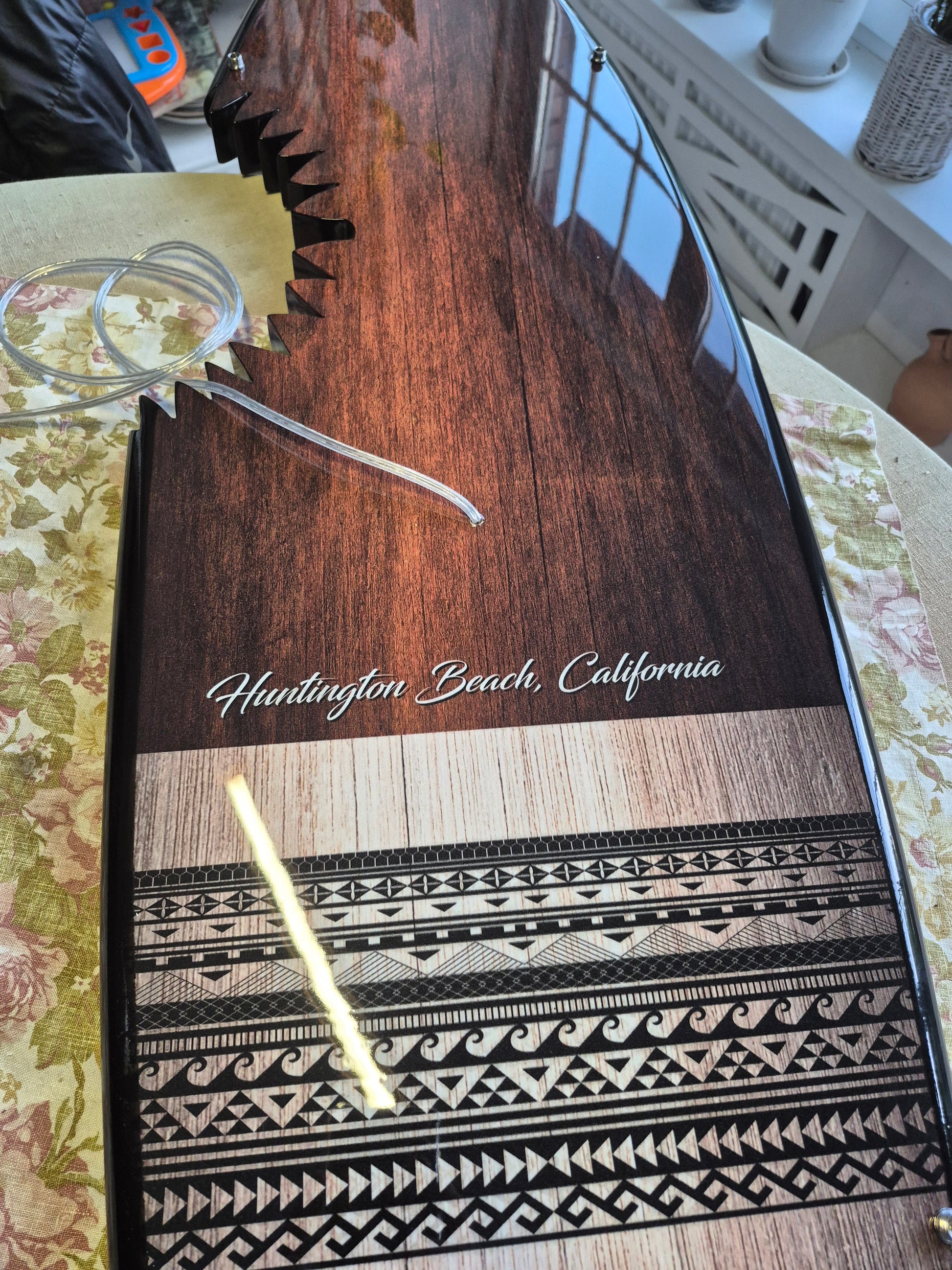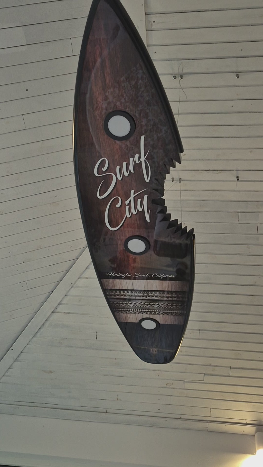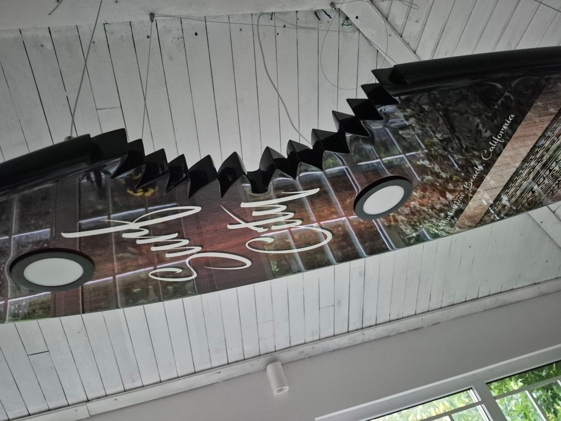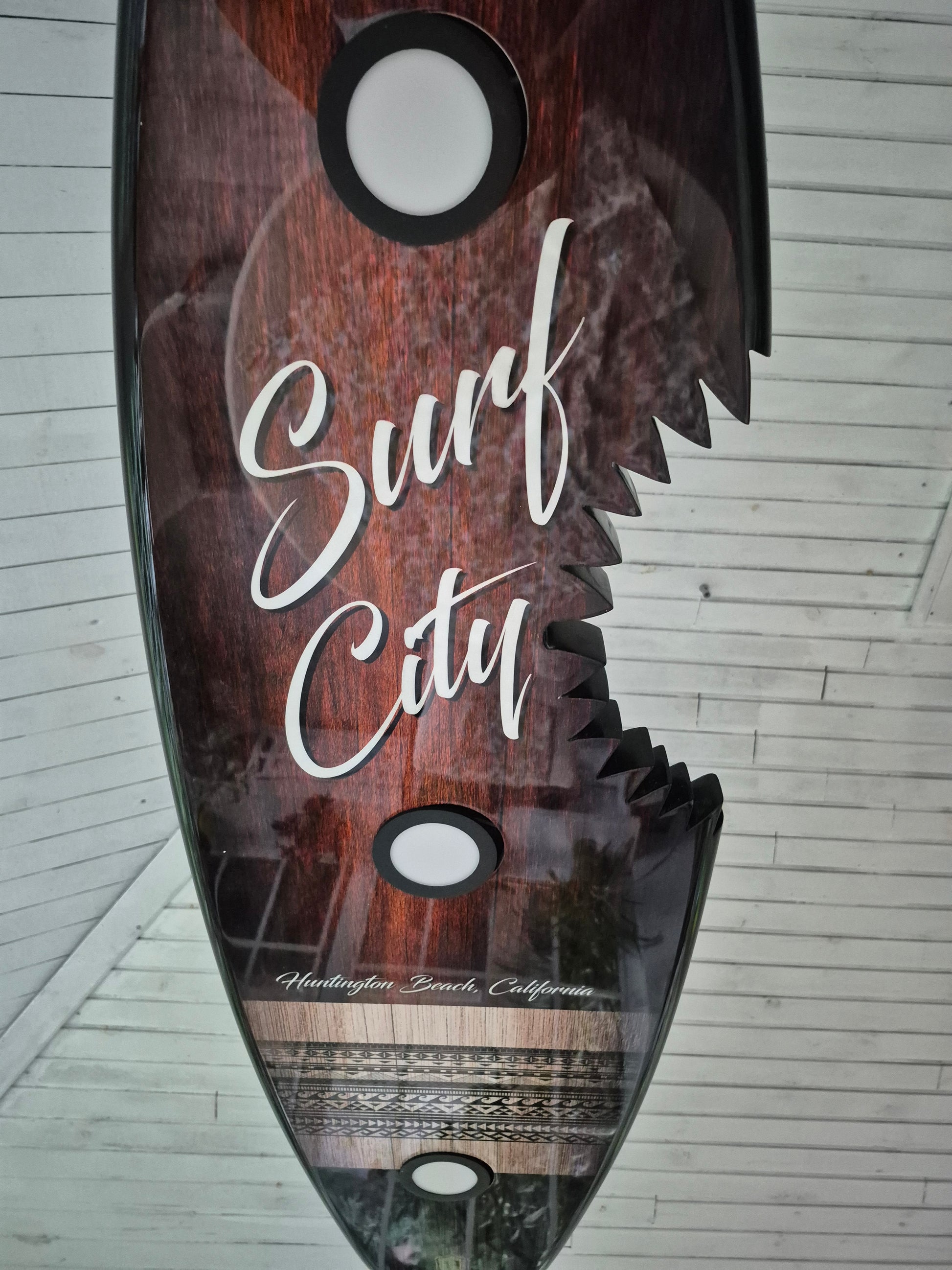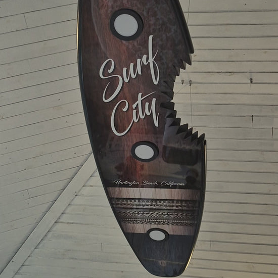 Designed for a client in Huntington Beach — the iconic Surf City, USA — this piece blends surf culture, coastal style, and a touch of storytelling. The deep wood tones and tribal-inspired patterns on the board bring warmth and character, while the jagged shark bite adds an edge that sparks conversation every time someone walks in. It’s more than a light — it’s a frozen moment from a wild surf adventure, now suspended in midair.