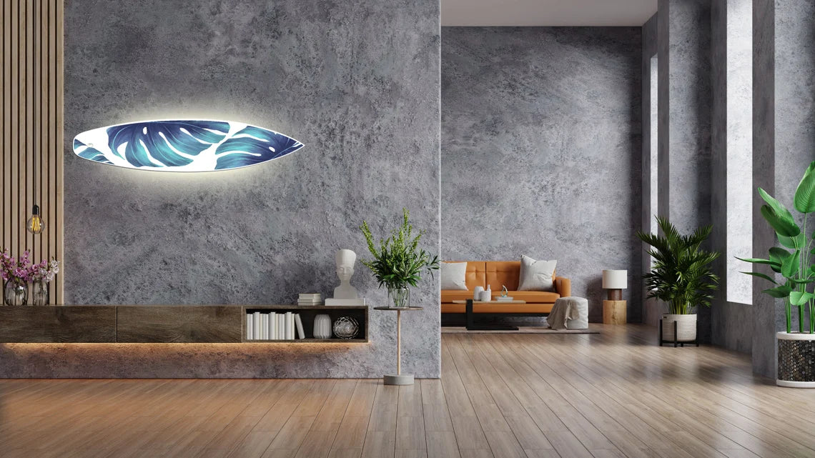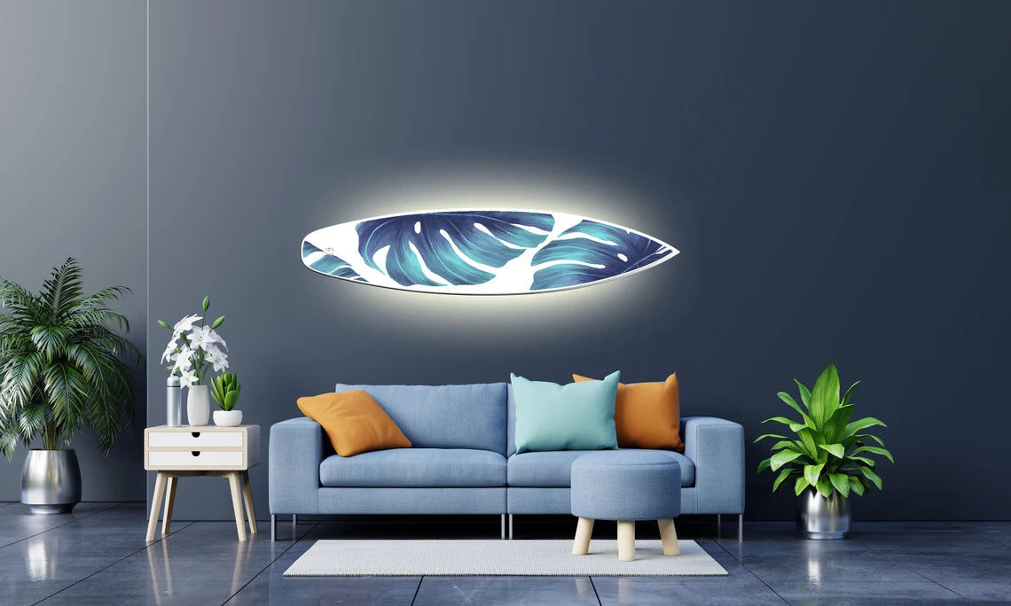 Surfboard-Shape Wall Led Light With Monstera Realistic Print: Surfing Inspired Wooden Blue-White Lighting Fixture as Unique Decor