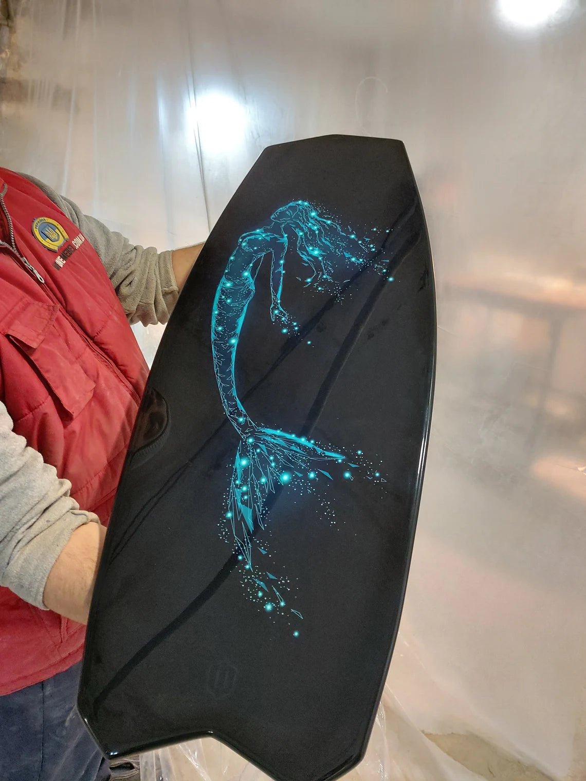 Fish Surfboard Inspired Wooden Surf Table with Mermaid Pattern