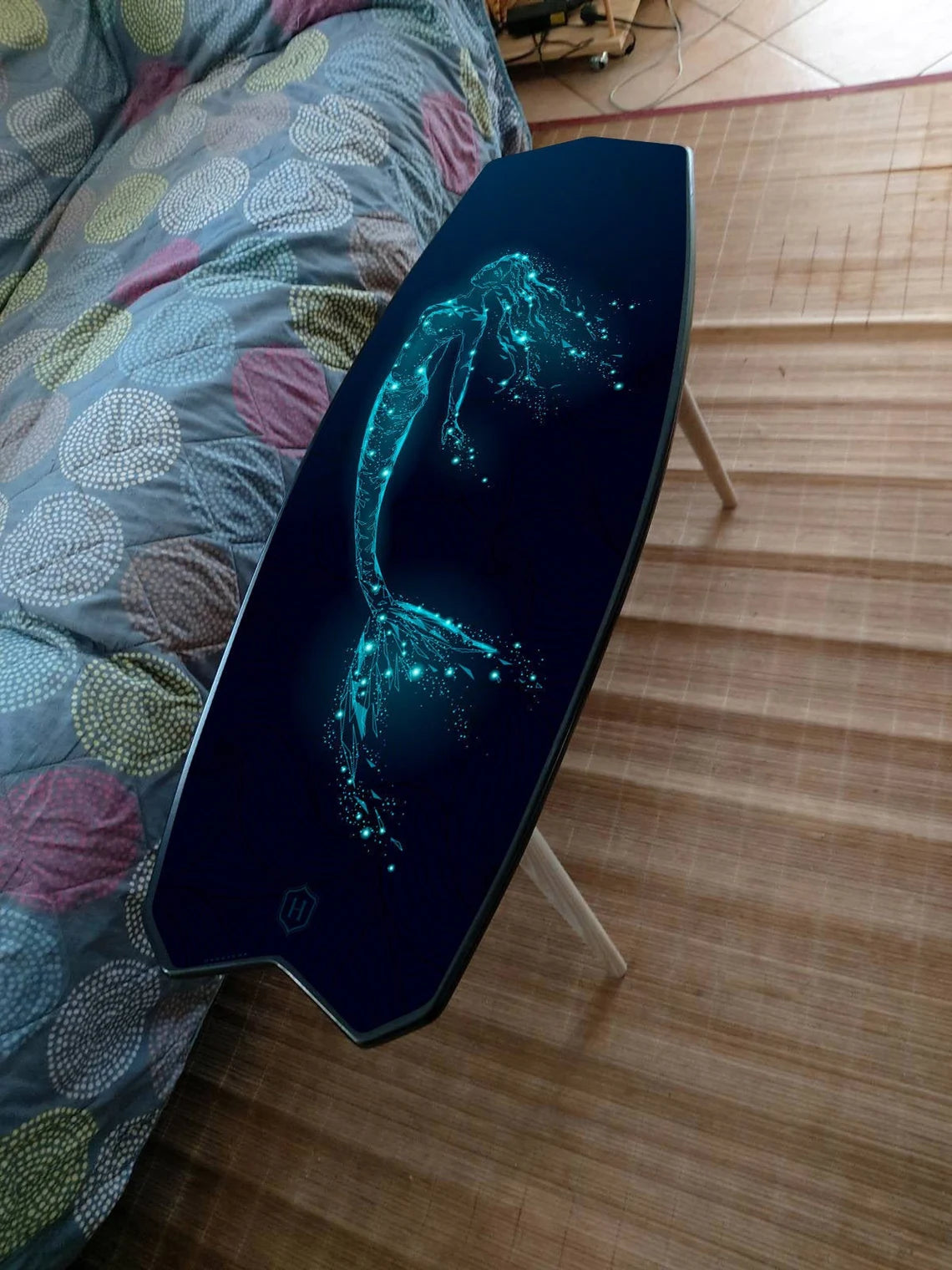 Looking for a stylish and original coffee table that will make a statement in your home? Look no further than our Fish Surfboard Inspired Wooden Surf Table with Mermaid Pattern. This beautiful table is made with durable wood legs that are coated with several layers of polyurethane varnish, making it perfect for any room. The unique surfboard design is perfect for any beach lover or ocean enthusiast, and is sure to start a conversation. So bring the waves indoors and add this table to your home today!