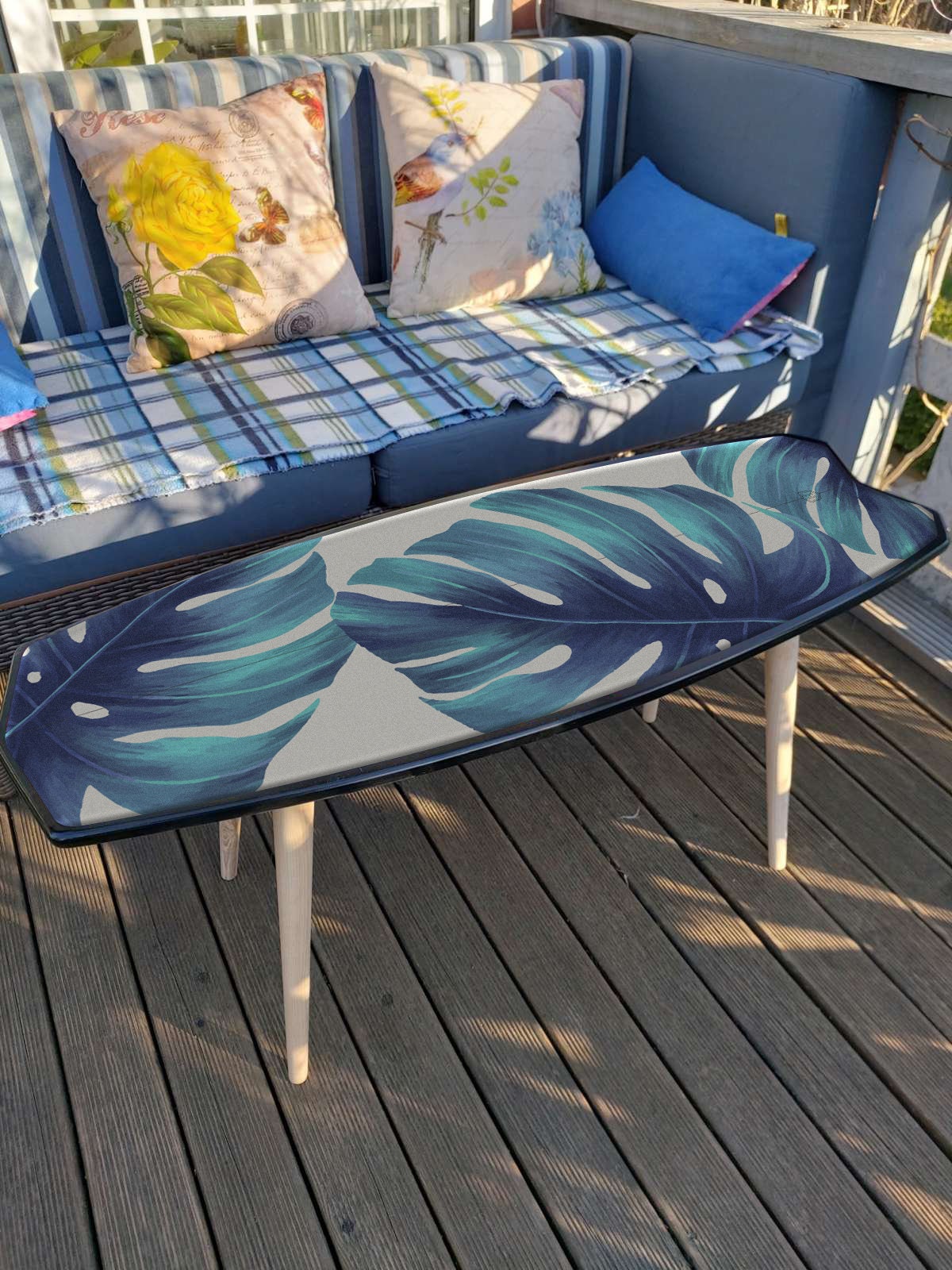 Elevate your contemporary tropical decor with our handcrafted asymmetric wooden coffee table. This modern table features a white surface adorned with a vibrant blue monstera leaves print, reminiscent of the ocean and surf culture. Crafted with care, this patio table adds a stylish and original touch to any space. The durable ash wood legs are coated with multiple layers of polyurethane varnish for longevity. Measuring 100x38 cm with a height of 50 cm, this unique coffee table is perfect for indoor or outdoor use. Explore our store for more amazing table designs!