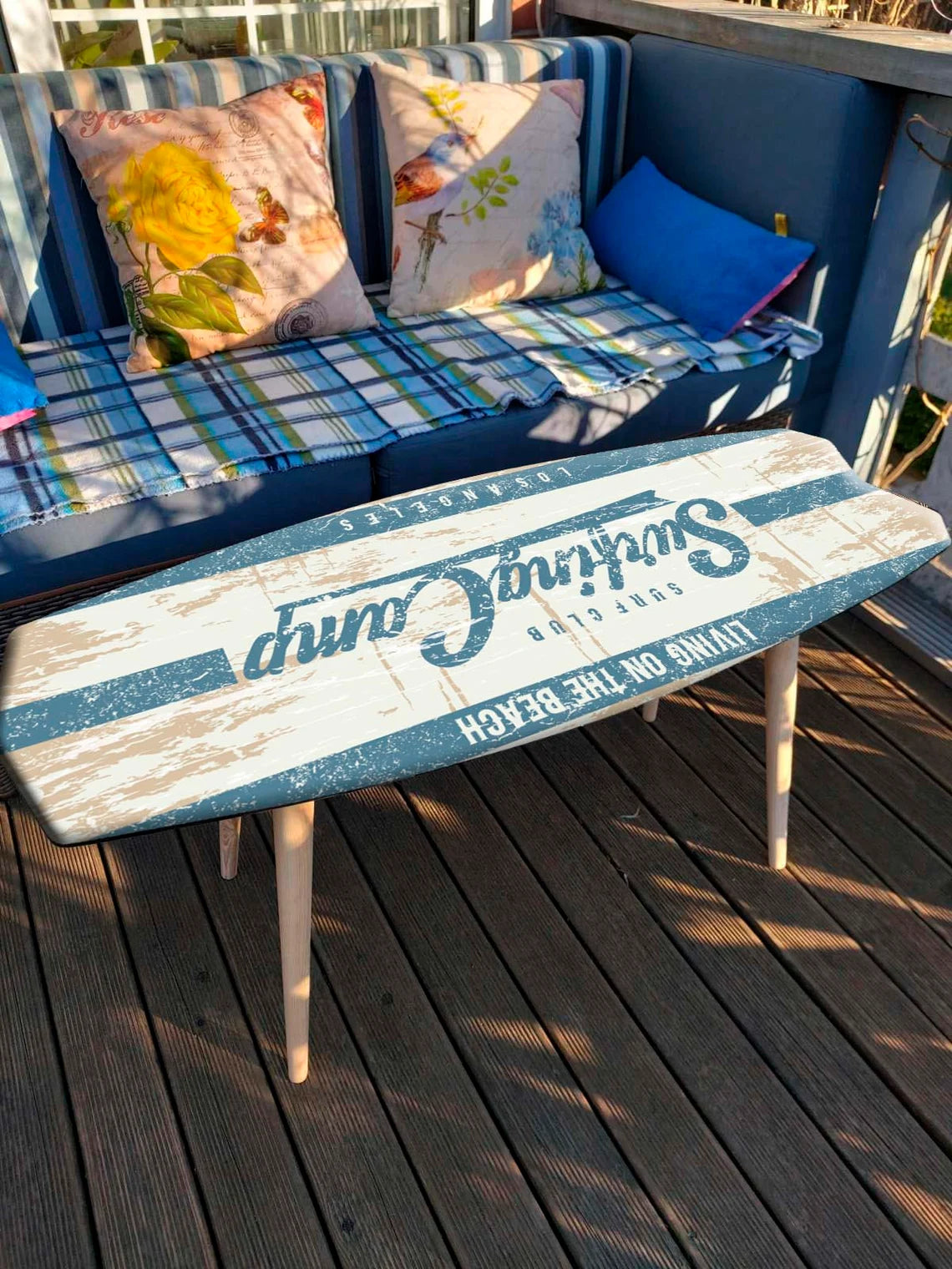 Surfboard Shaped Law Coffee Table With Ocean Wave Realistic Print: Surfing Inspired Handmade Wooden Blue-White Small Table in Nautical Style.