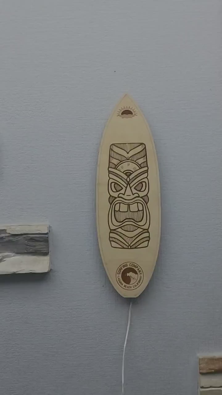 Surfing Inspired Wall Led Lighting Fixture With Koi Fish Zen Print: Surfboard Shaped Wooden Nightstand Lamp as Japanese Style Light Up Decor.