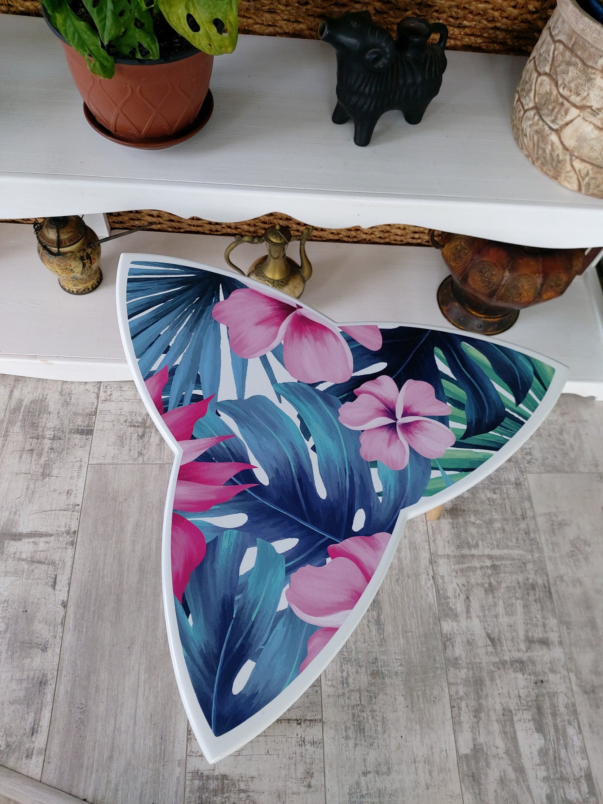 Experience the essence of summer with our tropical trefoil wood coffee table. Its irregular shape and eye-catching design featuring palm leaves and pink flowers will transport you to the beach, evoking memories of surfing, ocean waves, and carefree emotions. This stylish and original table is not only a decorative piece but also a functional addition to your interior. Crafted with love, the table's ash wood legs are coated with polyurethane varnish, ensuring durability. Measuring 50 cm in height and with a distance of 50 cm between the ends, this trefoil-shaped table will bring a touch of surf-inspired elegance to any space. Discover our full range of unique handmade tables in various shapes and finishes, perfect for coffee tables, dining tables, and more. Visit our store and let us create the personalized piece of your dreams.