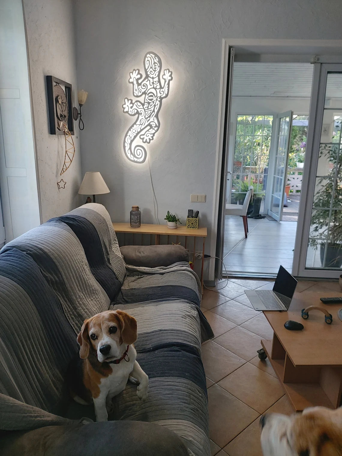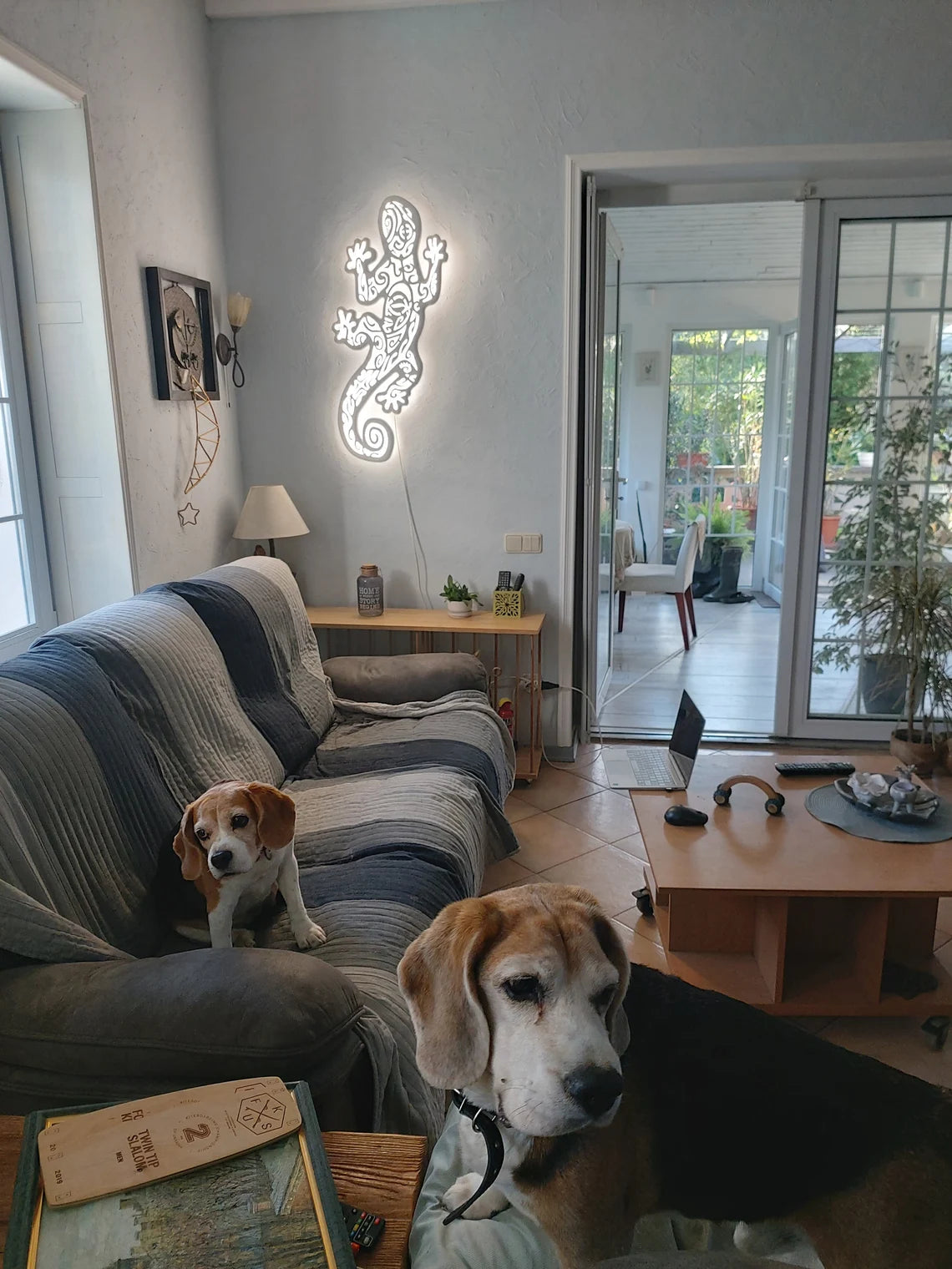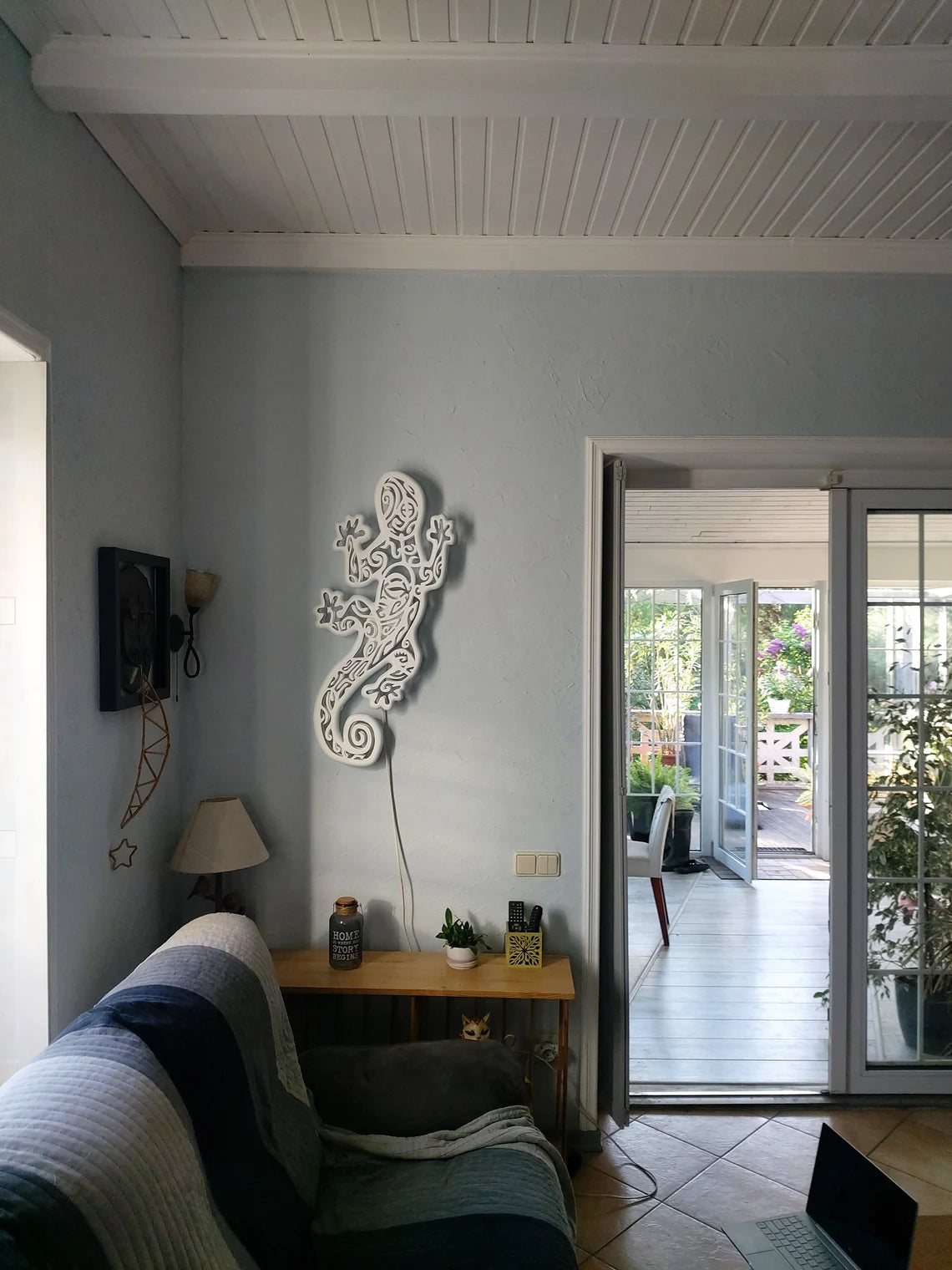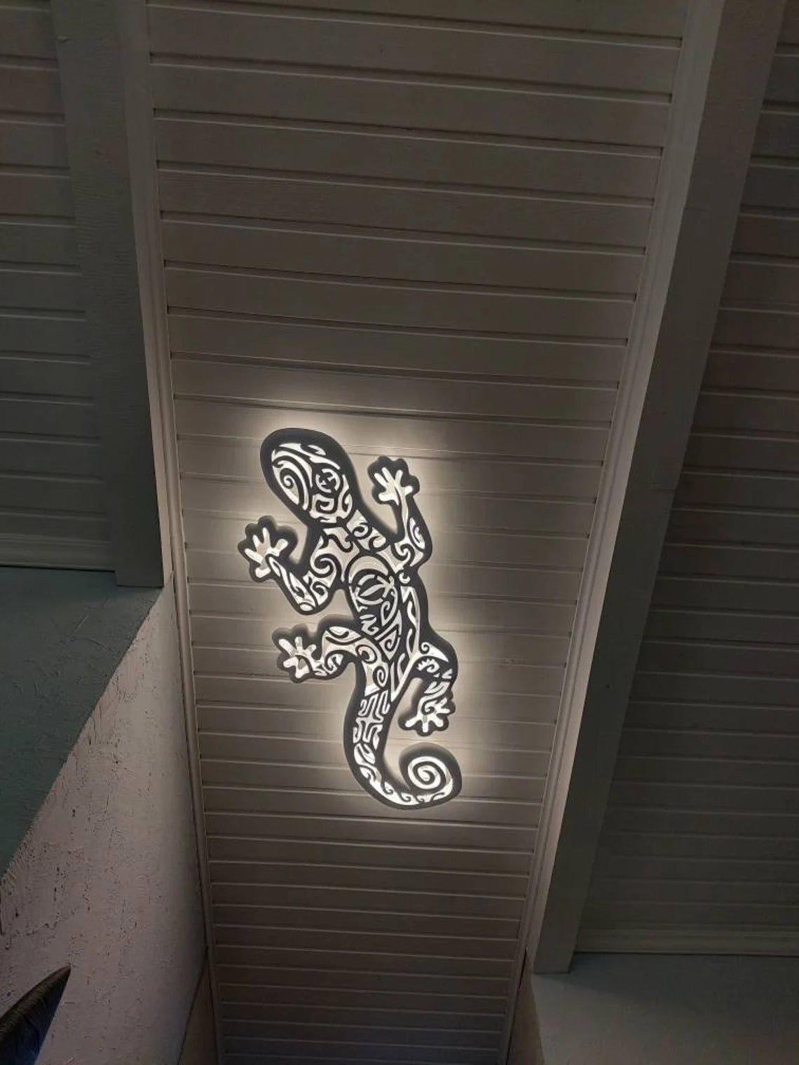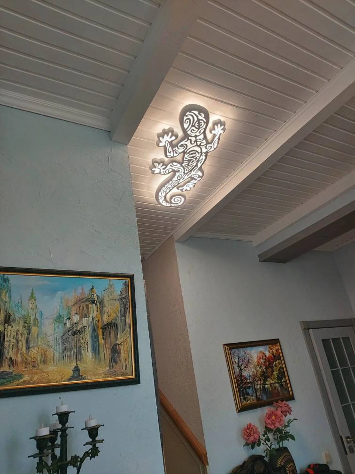 We offer a new, very beautiful handmade ceiling lamp. The lamp with the silhouette of a gecon with a drawing in the Maori style. It will not only be a beautiful element of the interior. It can decorate any interior - children's room, living room, office. It will attract attention everywhere.